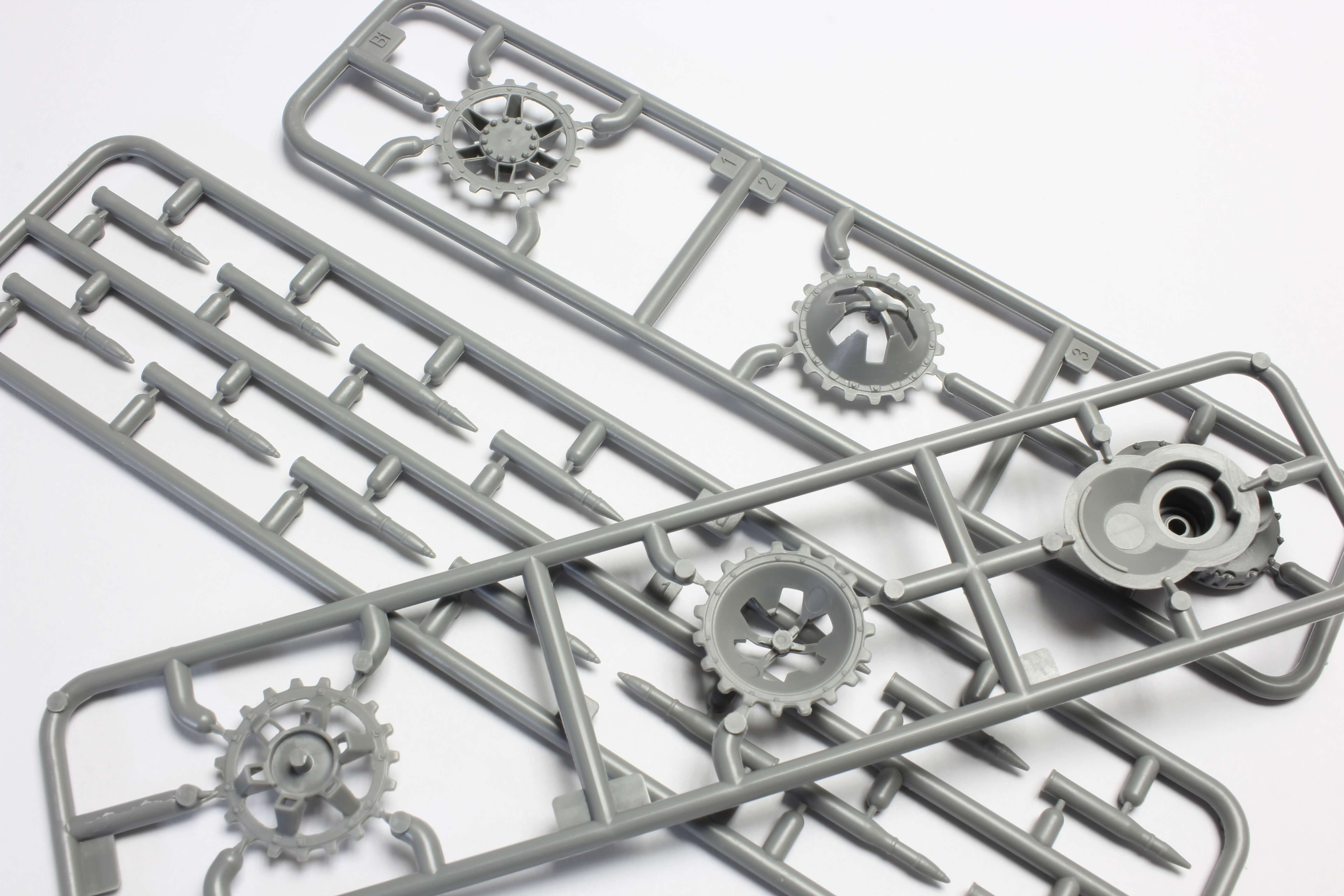 Díly jsou vylisovány naprosto precizně, bez posunutí formy nebo jiných vad. Jemná dělící rovina je patrná, ale neshledal jsem díly, kde by to bylo nějak extrémní. Vyhazovače budeme muset někdy tmelit, ale jsou vždy na interiérových dílech – respektive z interiérové strany dílu, daň za provedení s kompletním interiérem. Ale velké množství jich po složení nebude vidět – budou schovány za vybavením – ale něco tmelit bude třeba.