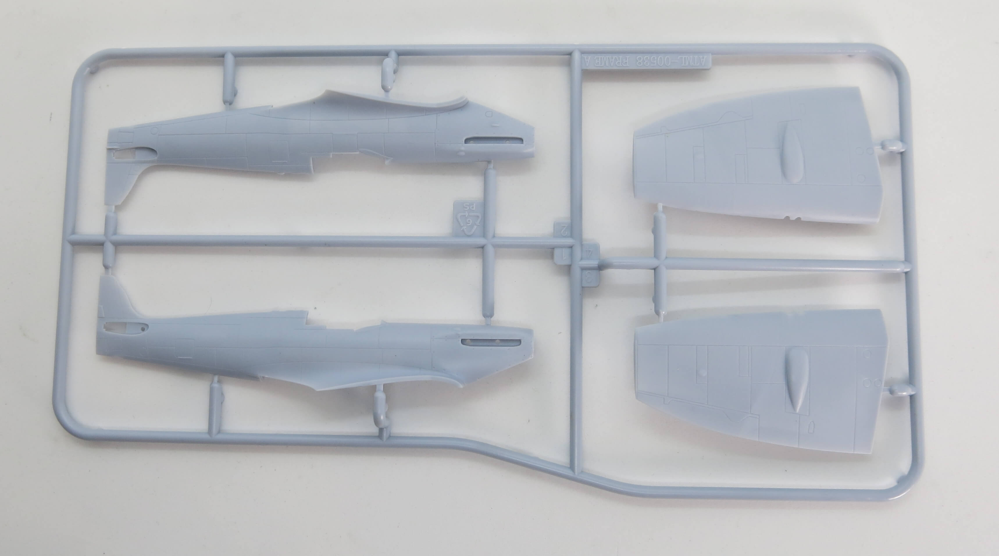 Na rámečku s polovinami trupu je druhá sada vrchních dílů křídla. Tentokrát pro verzi se zkrácenými konci křídel. Modelář nemusí nic řezat. Hezké ulehčení práce.