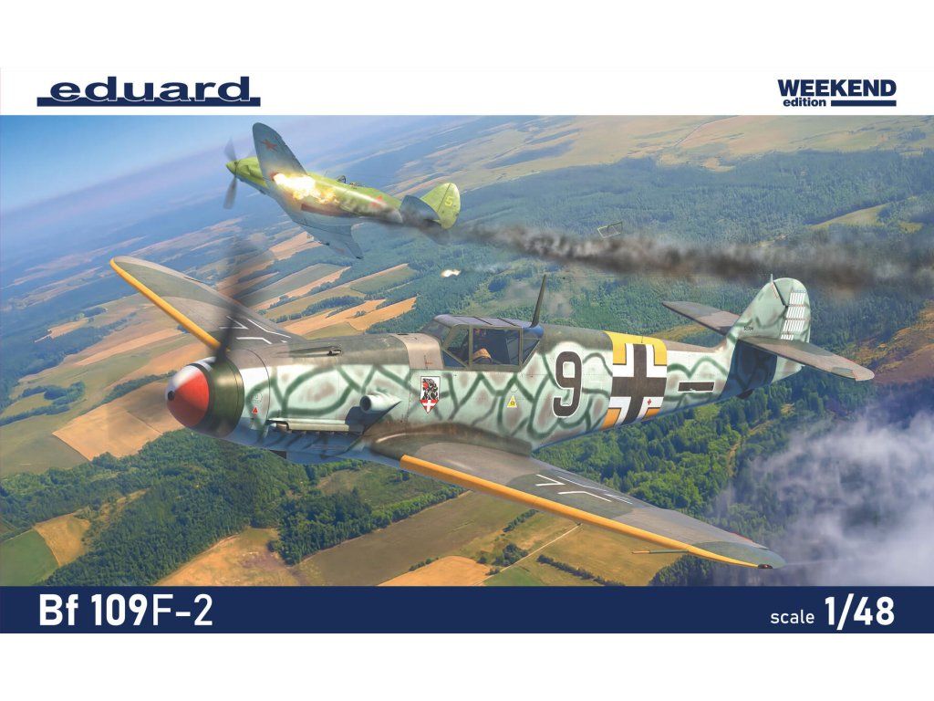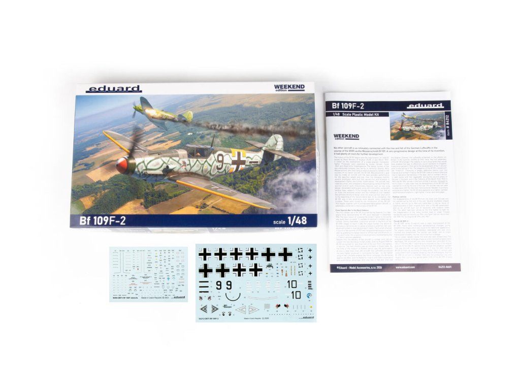 Stavebnice německého druhoválečného stíhacího letounu Bf 109F-2 v měřítku 1:48; edice Weekend. Neobsahuje barvy ani lepidlo.