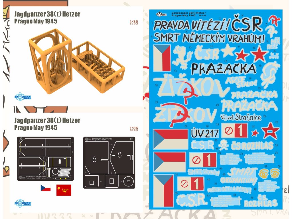 Jagdpanzer 38(t) známý jako „Hetzer“ byl lehký německý stíhač tanků na podvozku československého lehkého tanku 38(t). V Praze v květnu 1945 se několik těchto strojů dostalo do rukou povstalců — často šlo o nedokončené nebo odstrojené kusy, u nichž chyběla hlavní lafetovaná dělová houfnice. Povstalecké „Hetzery“ bývali natřeni výraznými nápisy, graffiti a improvizovanými znaky (československé trikolóry, hesla proti Němcům ap.), které je činily snadno rozeznatelnými v uličním boji. Mnohé fotografie z května 1945 ukazují stroje s hesly typu „Smrt německým vrahům“ či s místními politickými nápisy — zřetelným projevem odporu Pražanů. Technicky šlo o nízký, kompaktní stroj s náklonovými pancéřovými plochami; když chyběla hlavňová výzbroj, upravovali povstalci otvor pro dělo tak, aby sloužil pro kulomet nebo byl zatlučen plechem — zkrátka improvizovali podle dostupných dílů a potřeb městského boje. To činilo jedny kusy vizuálně odlišné od standardních polních nasazení.Diskuze