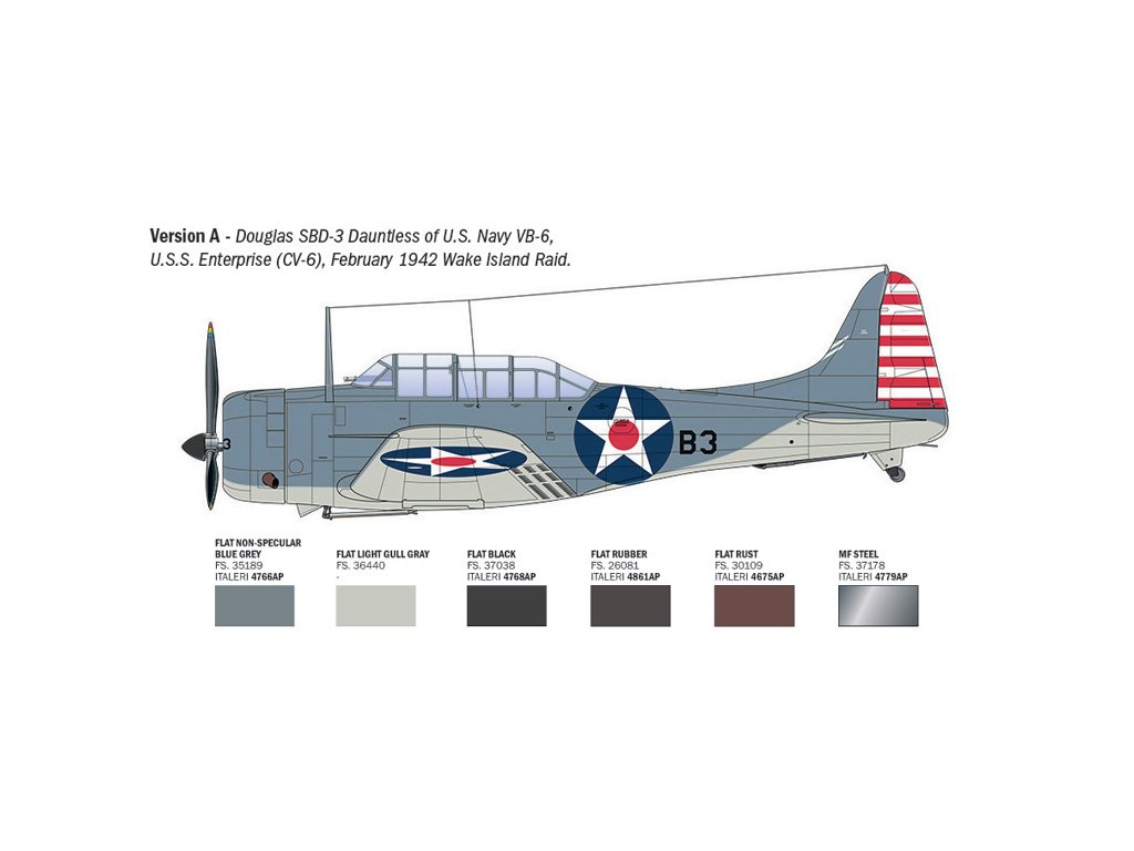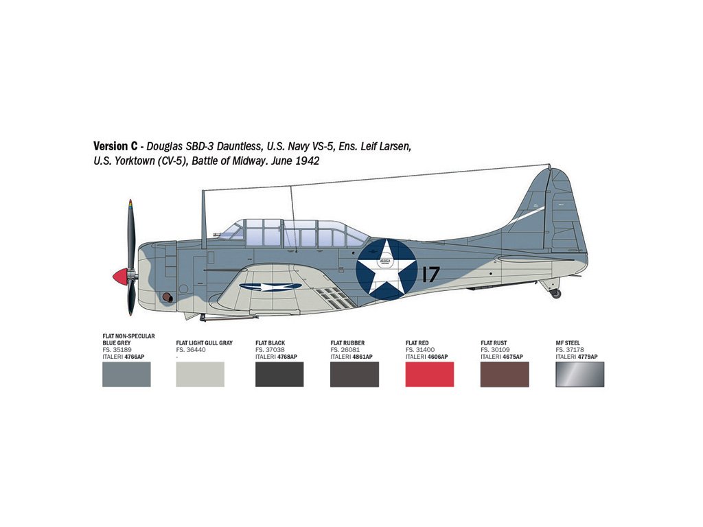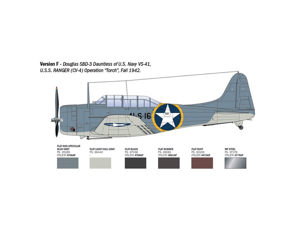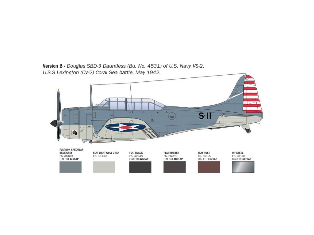 Douglas SBD „Dauntless“ byl jednomotorový dolnoplošník a nejrozšířenější palubní střemhlavý bombardér amerického námořnictva během druhé světové války. Do aktivní služby amerických leteckých jednotek vstoupil v roce 1941 a mohl být použit jak pro průzkumné mise, tak pro střemhlavé bombardování. SBD-3 se stal skutečným hrdinou bitvy o Midway (červen 1942), zlomového bodu ve válce v Pacifiku, kde sehrál klíčovou roli při potopení japonských letadlových lodí. Poháněn hvězdicovým motorem Wright R-1820 Cyclone mohl dosáhnout maximální rychlosti 410 km/h. SBD-3 byl schopen nést téměř 2 000 kg bomb. Byl také vybaven dvěma dopředu střílejícími kulomety ráže 12,7 mm a dvěma dozadu směřujícími kulomety ráže 7,62 mm. Posádky si jej vysoce cenily pro svou robustnost a pevnou konstrukci.Diskuze