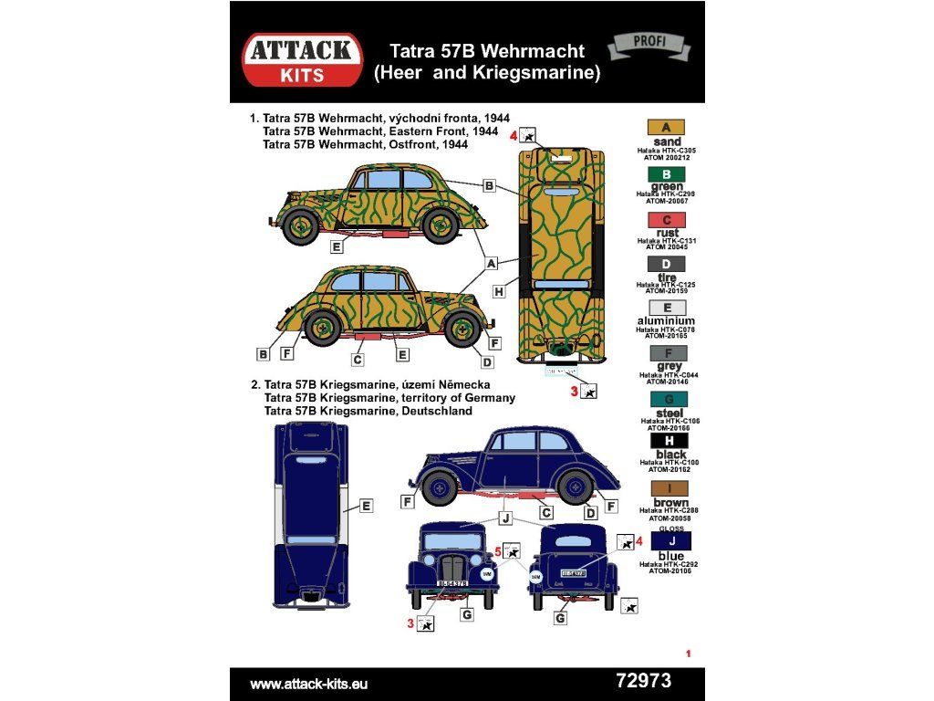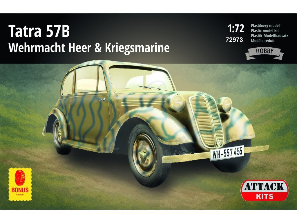 Tatra 57B byla vylepšeným nástupcem osvědčené Tatry 57 s výkonnějším motorem a přepracovanou pozicí řidiče, která odrážela designové trendy z konce 30. let 20. století. Vyráběla se pro civilní i vojenské zákazníky, mnoho vozů později vstoupilo do německé služby – převzal je Wehrmacht a/nebo byly zabaveny od soukromých majitelů – což z tohoto modelu činí perfektní volbu pro stavitele dioramat i automobilové nadšence. Počáteční Profi box v novém stylu balení obsahuje tři plastové rámečky: rámeček plný jemných detailů, zcela nový rámeček s hlavními komponenty a menší rámeček s čirými díly. Součástí balení jsou resinová litá kola pro vylepšení konečného vzhledu a samostatná sada masek bude k dispozici samostatně (72MASK013).Buďte první, kdo napíše příspěvek k této položce.