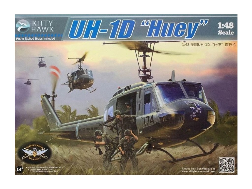 Plastiková stavebnice modelu vrtulníku od firmy Kitty Hawk v měřítku 1:48. Neobsahuje barvy ani lepidlo.